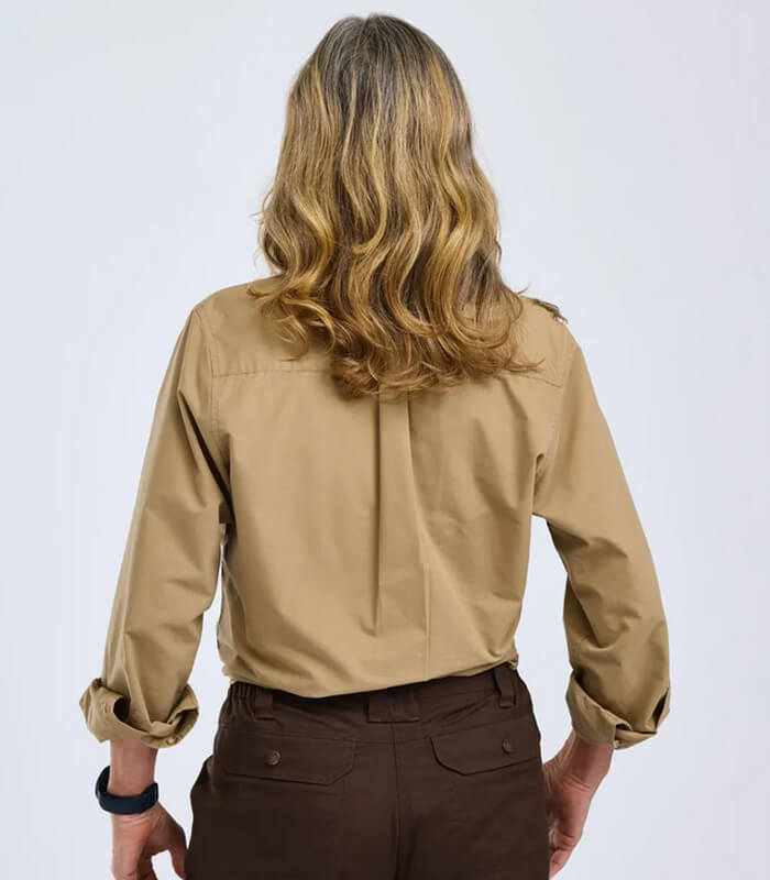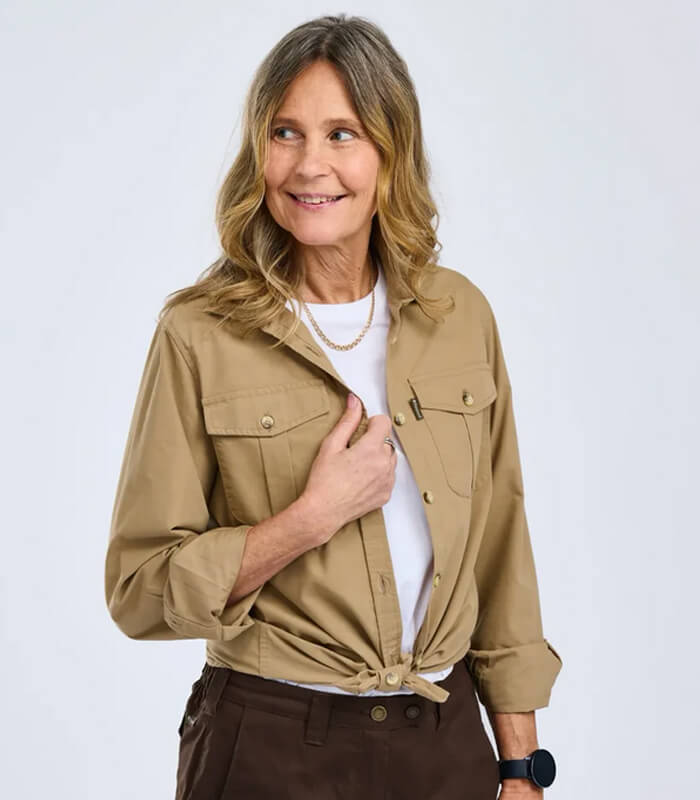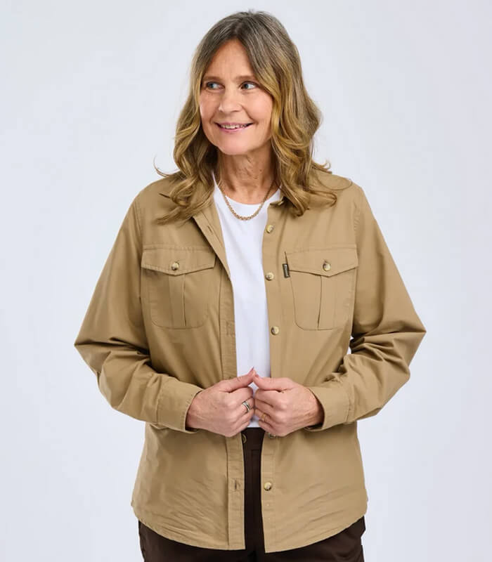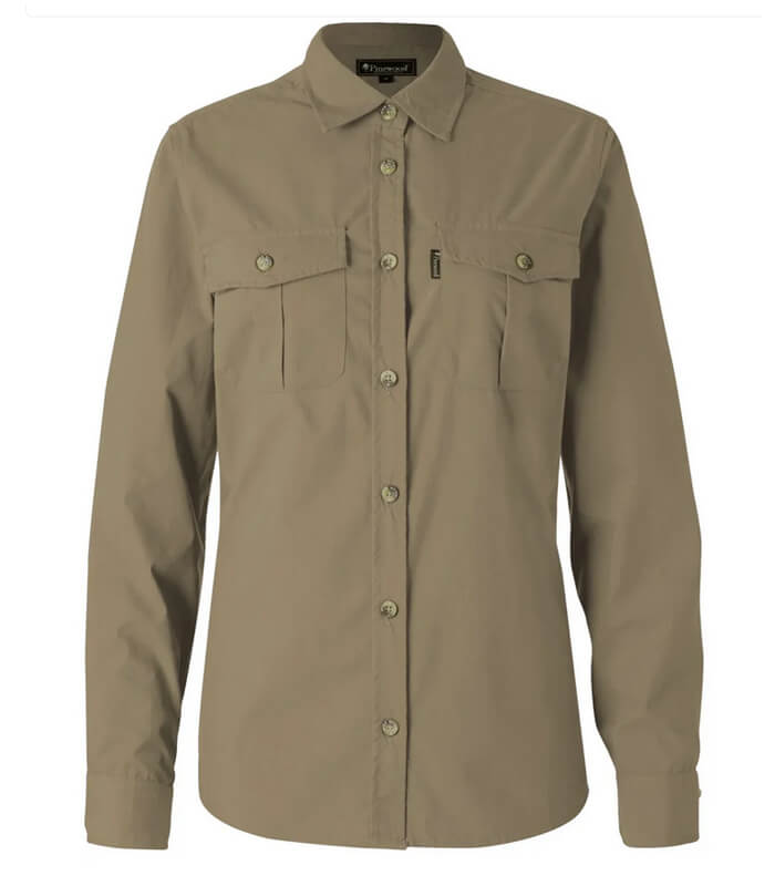 La camisa de manga larga de mujer Safari de la marca Pinewood está confeccionada en tejido prelavado que le da una sensación extra suave. Cuenta con dos prácticos bolsillos en el pecho con cierres de botones. El material duradero lo convierte en una prenda versátil, igualmente adecuada para el uso diario y las aventuras al aire libre.
