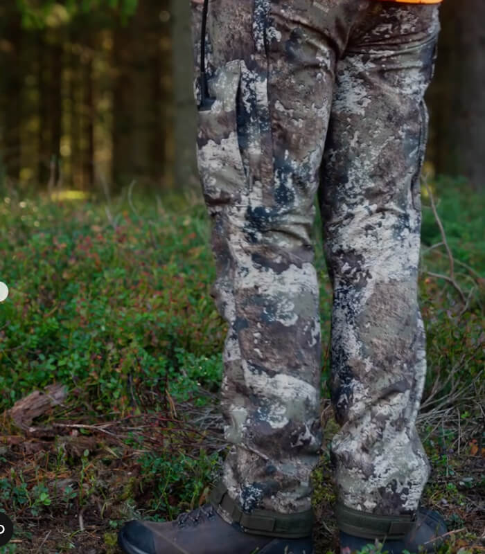 Pantalones silenciosos y ligeros en camuflaje Strata Blaze para el cazador activo y el rastreador de perros. Confeccionado en 100% poliéster reciclado.